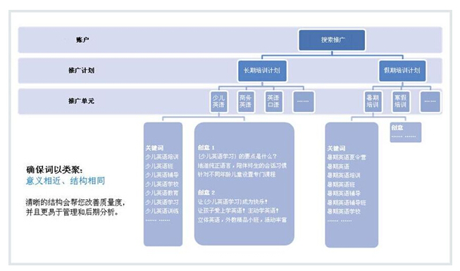 目前搜索营销的趋势是关键词越来越多,百度搜索推广产品为了方便用户管理关键词而设置了几个层级,经验表明,合理的账户结构设计以及精细的关键词分组,可以有效提升营销效果。所以在这里先介绍一下账户的结构。