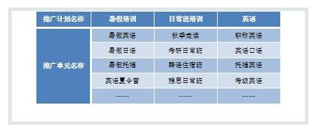 为每一个推广单元设置单独的“主题” ,如:可以将“成人英语单元”和“少儿英语单元”分别设置为两个推广单元。因为“成人”和“少儿”分别是不同意义的词,而且推广商户为这两类业务撰写创意的角度也会不同,因此需要分为两个不同的单元。